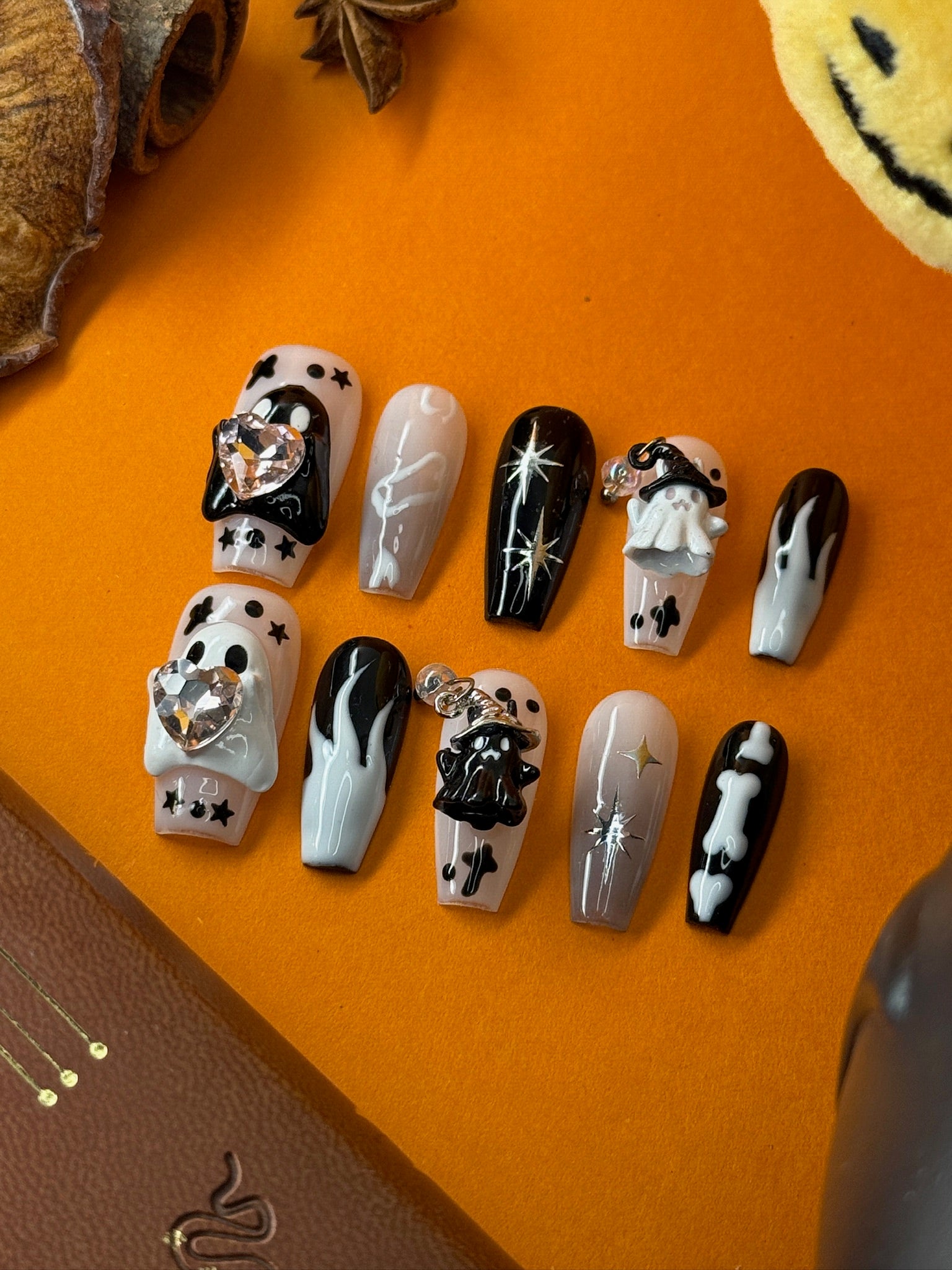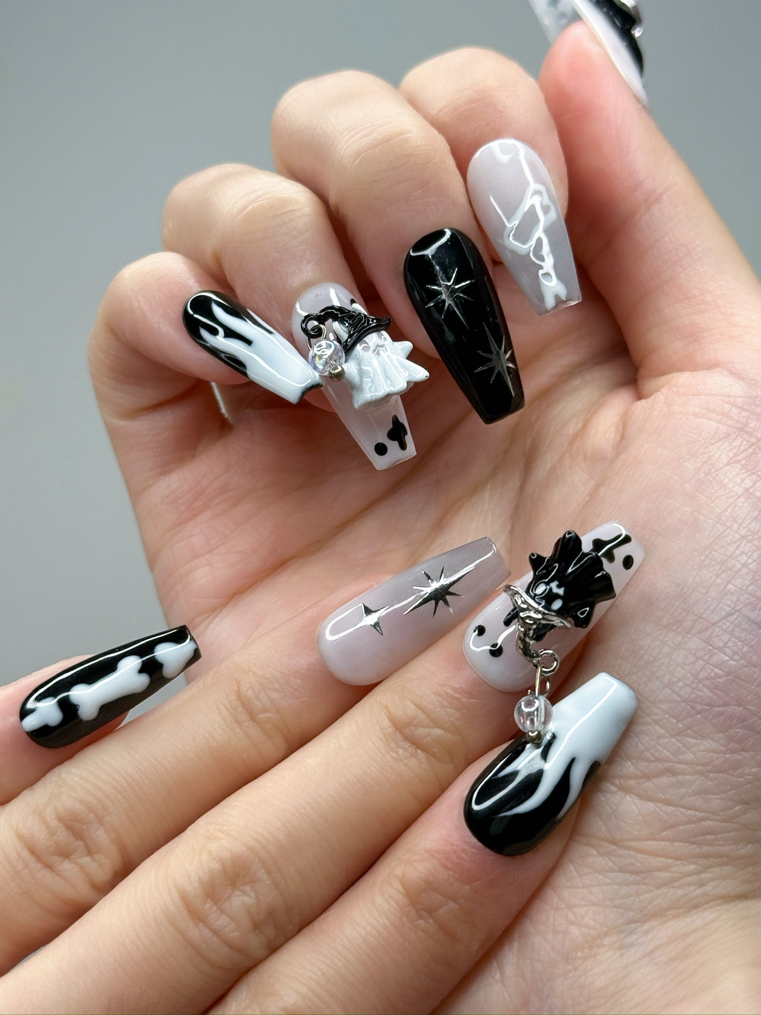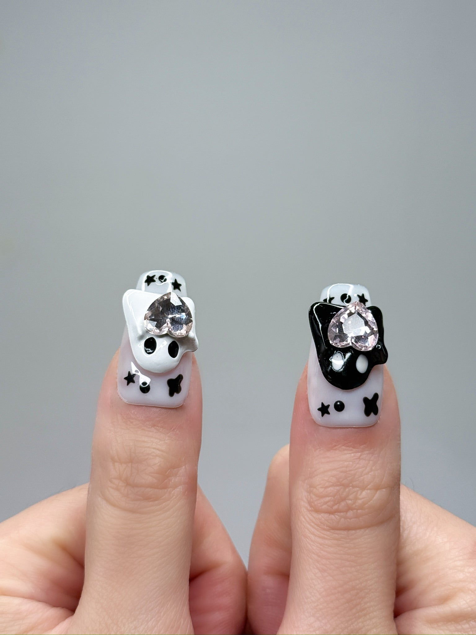 Plonge dans un univers mystérieux et adorable avec nos press on nails Black Whisper. Ce set associe le noir et le blanc à de petits fantômes mignons, des cœurs en diamant et des détails délicats pour un look à la fois chic et espiègle. Parfait pour celles qui aiment le mystère tout en restant girly et élégante.