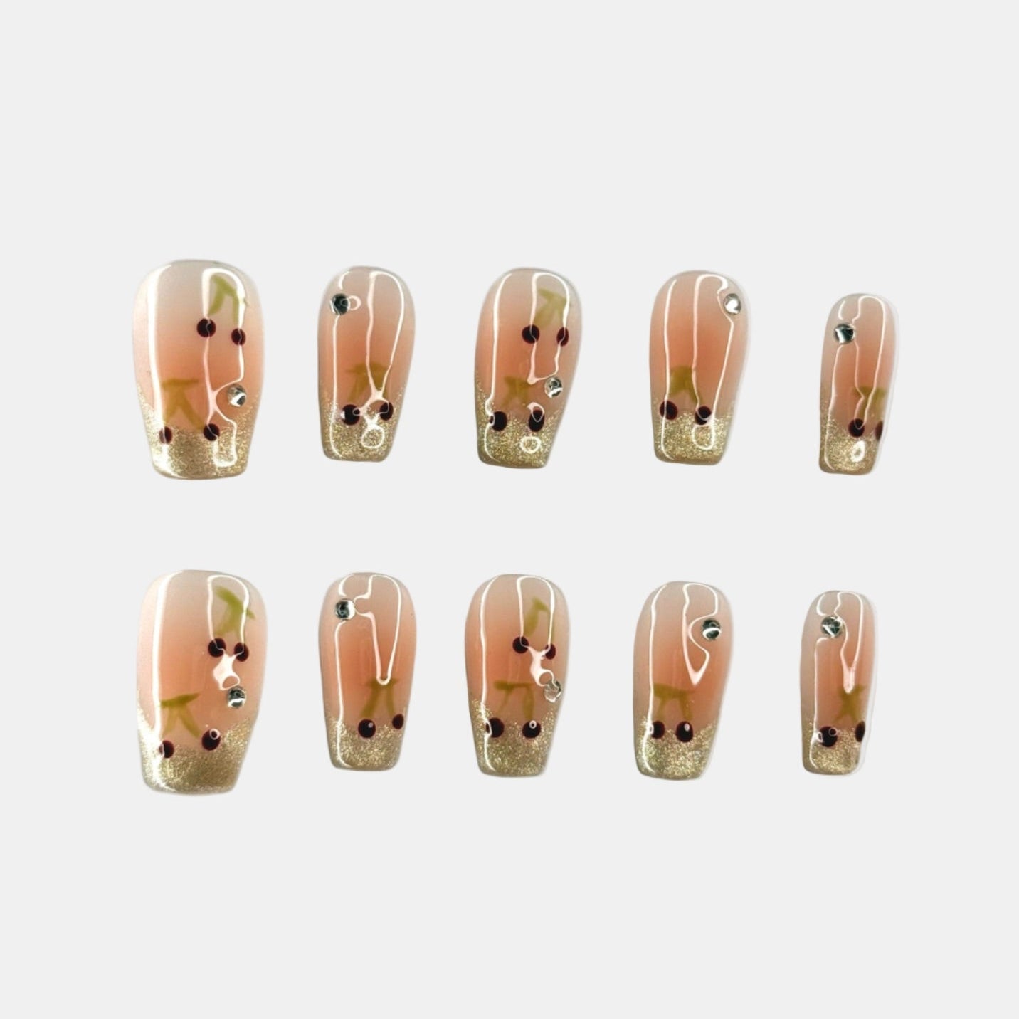 Gold Cherry French, ce sont des press on nails au design French magnétique doré sublimé par de petites cerises délicates. Un combo chic, fun et irrésistible qui donne du caractère à ton look tout en restant élégant.